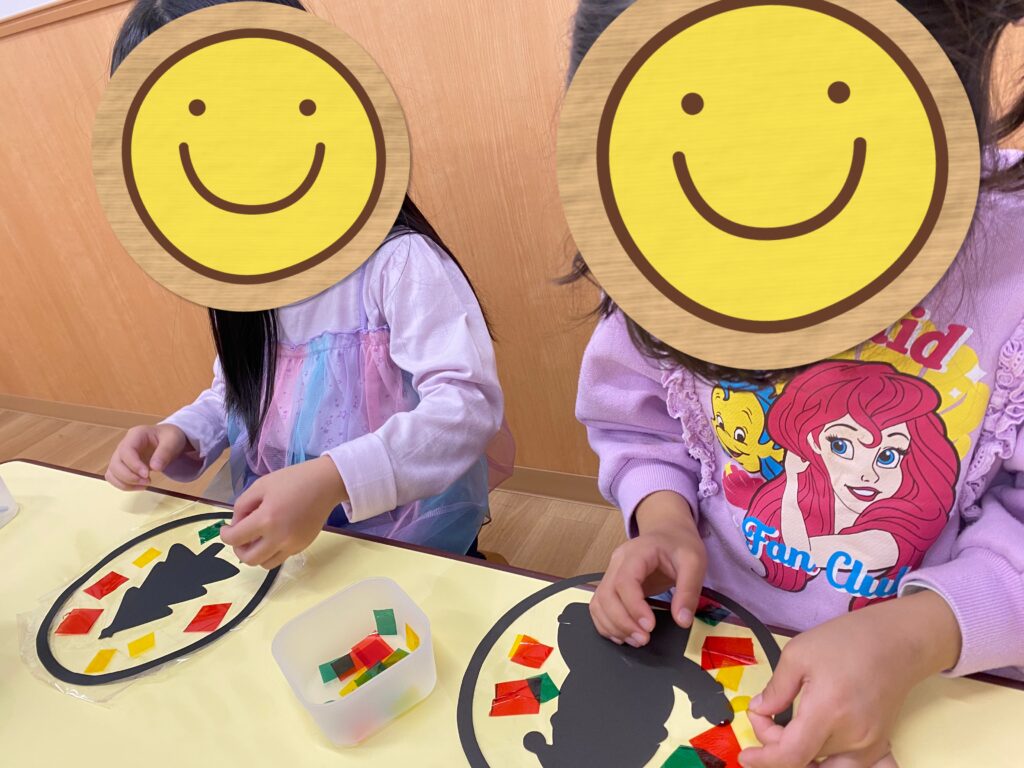 透明テープに画用紙で作ったクリスマスツリー🎄とサンタさん🎅を貼り、その周りにカラーセロハンを着けました!カラーセロハンを貼りステンドグラスが完成すると、「できた!」「かわいい!」と目を輝かせながら、嬉しそうに教えてくれました!✨