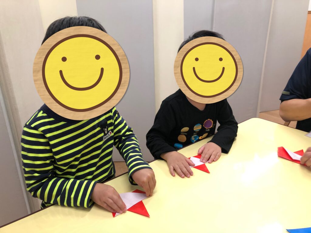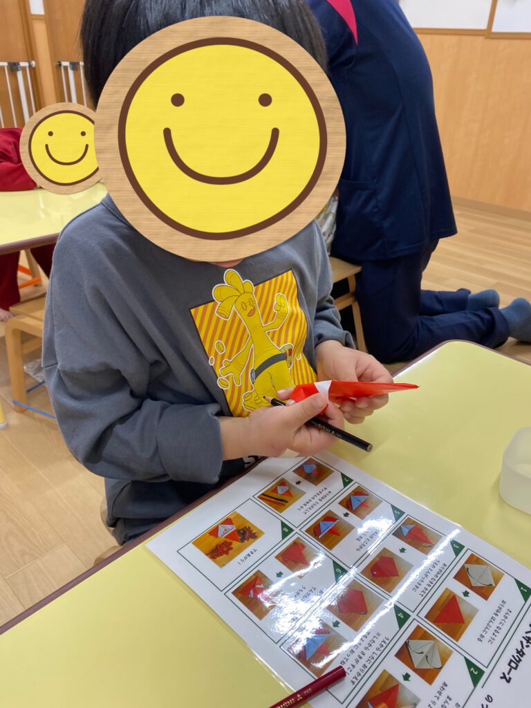折り紙でサンタクロースを作ると、「サンタさんできたー!」「どんな顔にしよっかな〜」など、ワクワクしながら絵を描いていた子どもたち🖍️