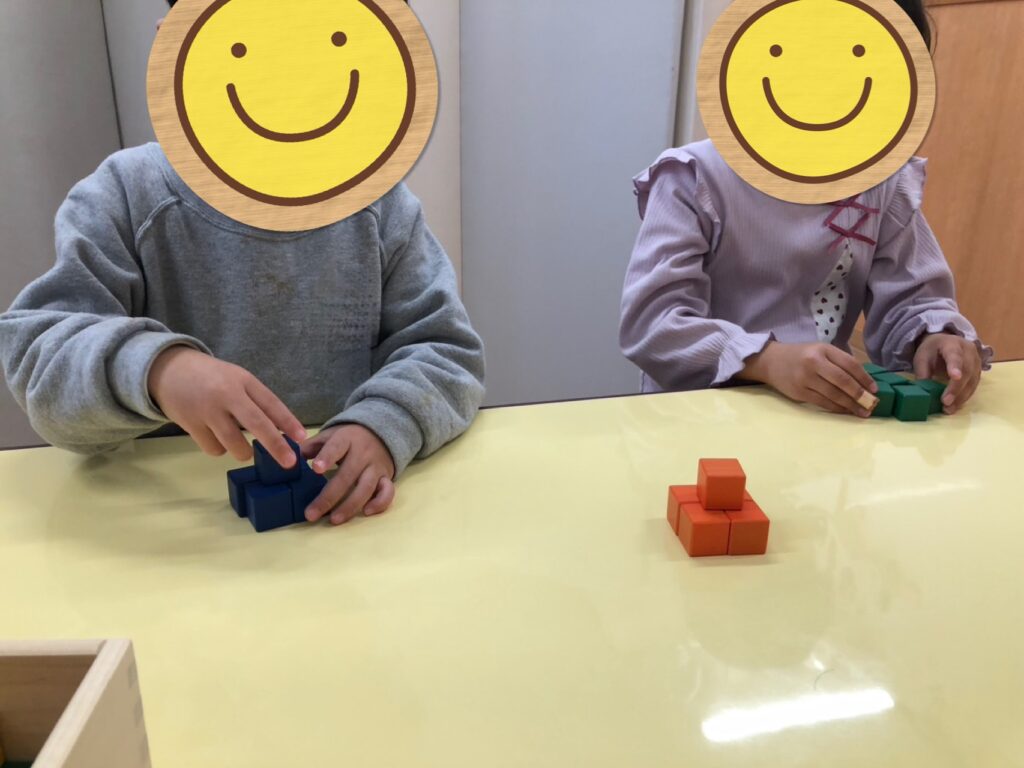 先生が作った見本をみて、同じ形を作ると言うゲームをしました!作っている間は目を瞑っており、「いいよー!」と言われると目を開けて、どんな形をしているのかしっかり観察していました👀