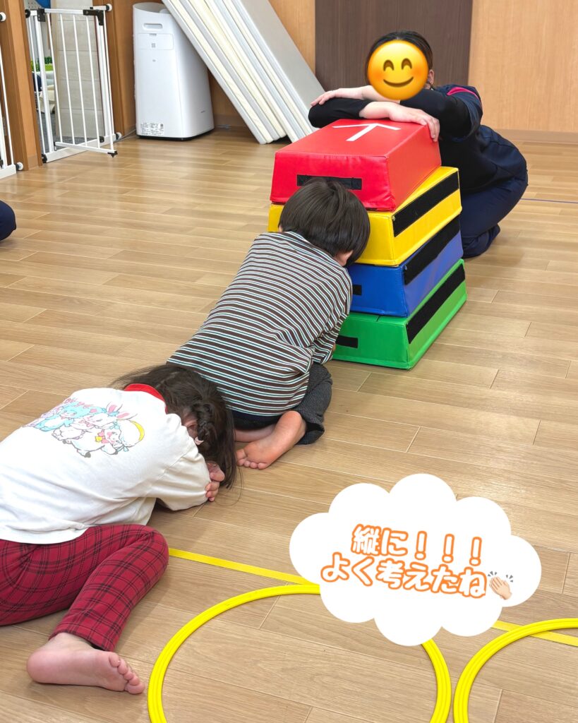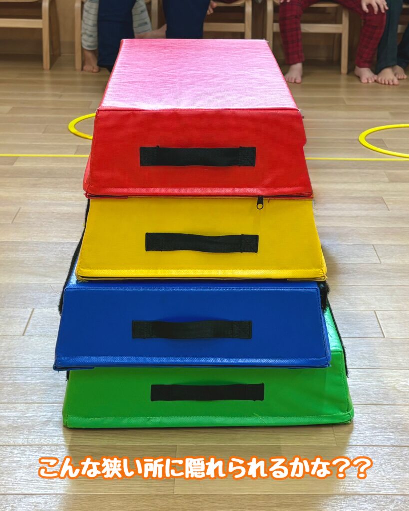 マットやプール、跳び箱などにお友達と協力して隠れてもらいました!